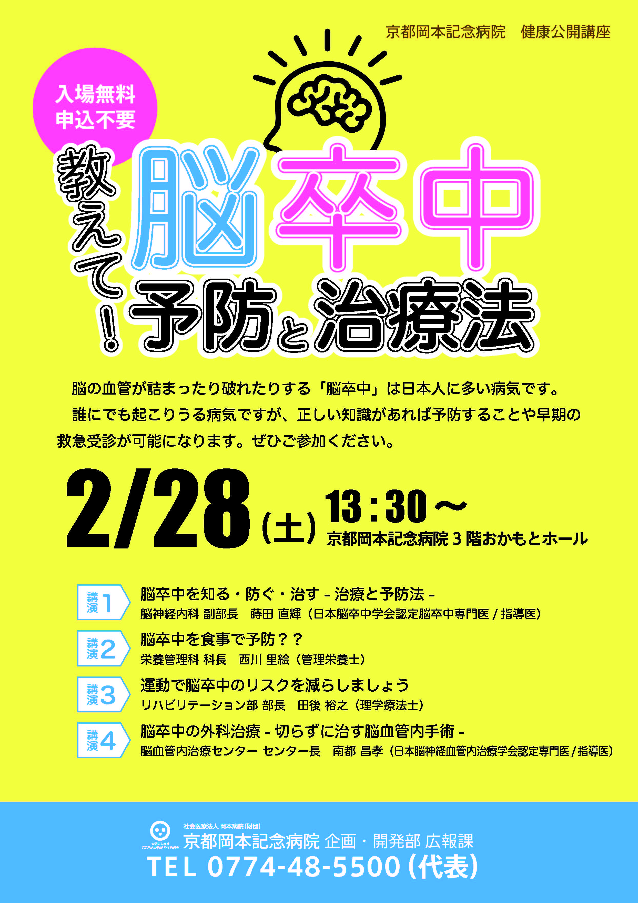 2月28日には「おかもとホール」(京都岡本記念病院3階)で脳卒中をテーマに開催いたします。ぜひおいでください。