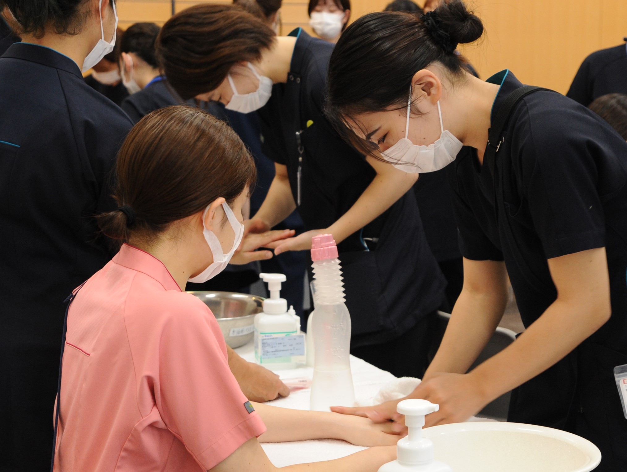 創傷の洗浄方法・除圧方法など講義のあと演習で学びました。