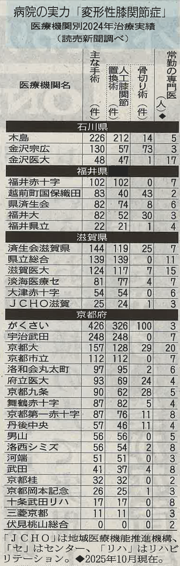 読売新聞2026年1月25日付朝刊に当院の「変形性膝関節症」の治療実績が掲載されました。